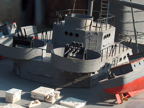 A hajótörzs hagyományos borda/palánk építésű, a felépítmények fémlemezből készültek. Már ami megvan. ajdnem. Az apróságok műanyag, réz és acél drót, injekciós tű felhasználásával készült.